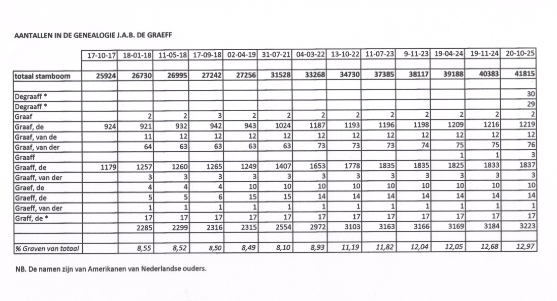 Kees de Graaff houdt zich bezig met de genealogie van de familie de Graaf(f). Hieronder vindt u een overzicht van de aantallen. Klik op de afbeelding voor een groter scherm.